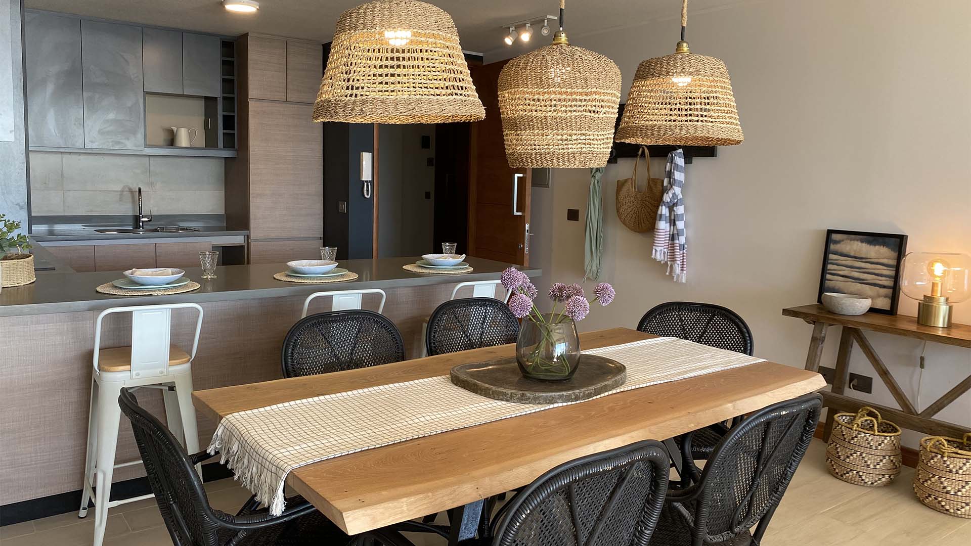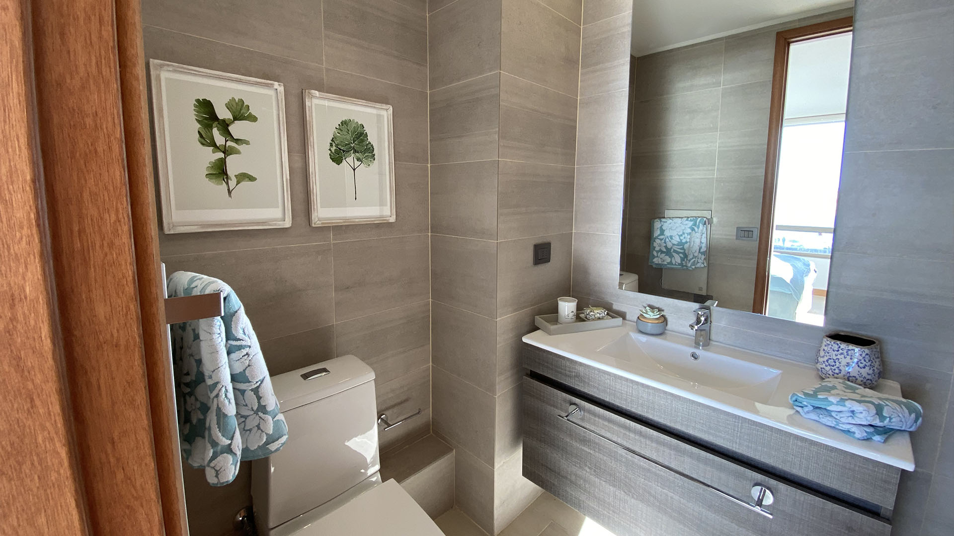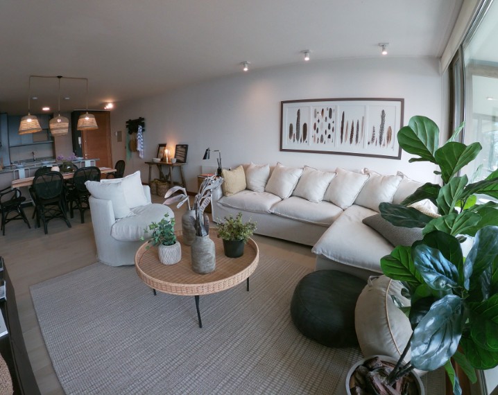 • Cocina amoblada y equipada con encimera vitrocerámica, horno empotrado, campana extractora, lavavajillas (2 y 3 dormitorios) y refrigerador paneleables con look madera.